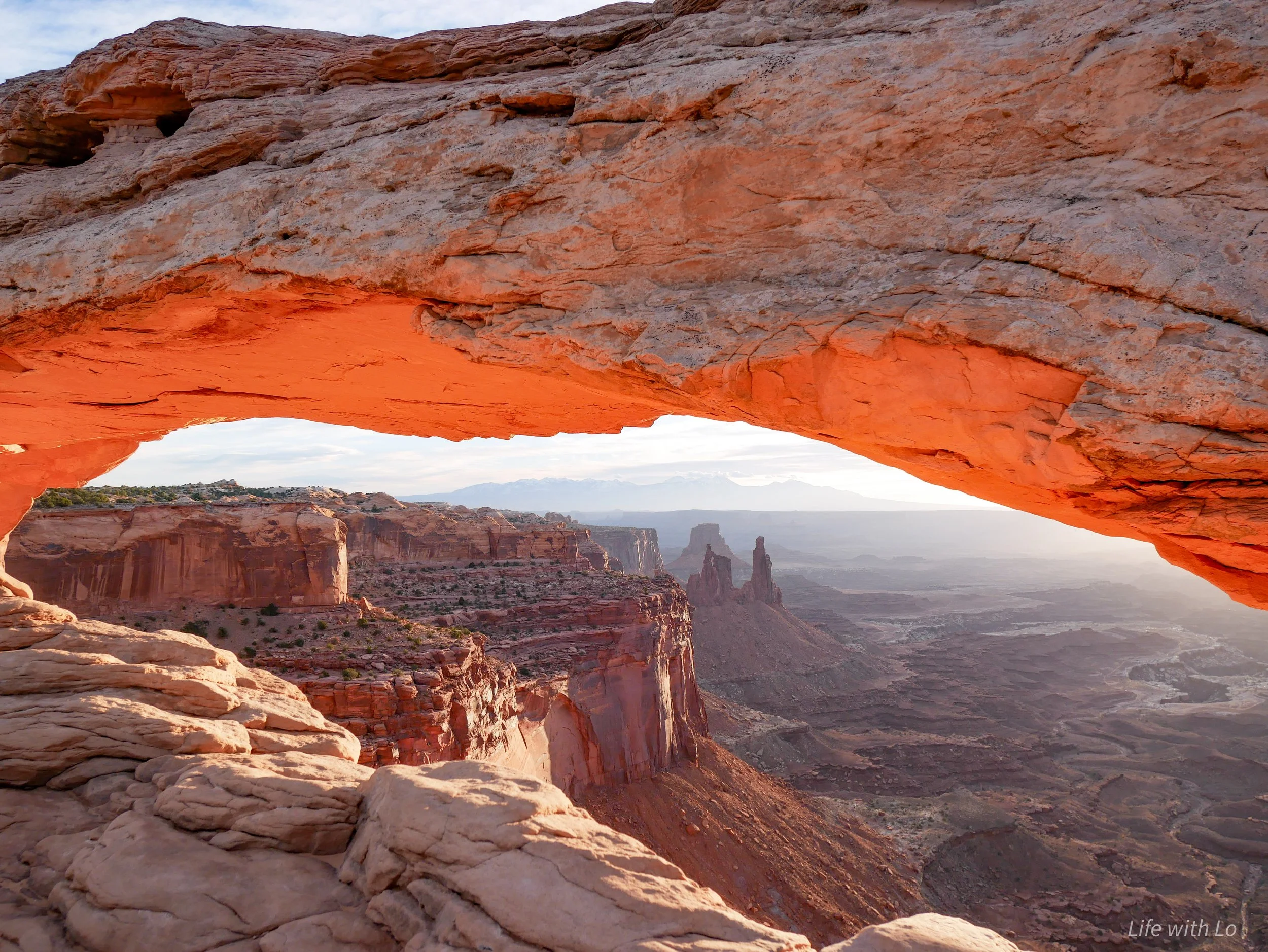 Mesa Arch: 0.6 miles round trip. Elevation gain is 56 feet. This is an easy trail that takes you to one of the most photographed areas in the park. A natural arch formed near the rim of the mesa, where you can look down into the vast canyons.