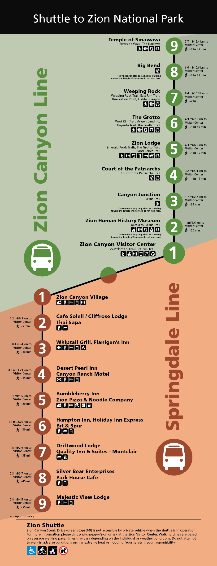 Due to the business of Zion and the narrowness of the Zion Canyon Scenic Drive you are not able to drive your own car through it for the whole year. The shuttle normally runs from March until December (during the months of January and February you are able to take your own car on the drive). The shuttle is free for visitors and comes every 10-15 minutes within the park and every 15 minutes for the Springdale shuttle. The current schedules for the shuttles is posted down below.